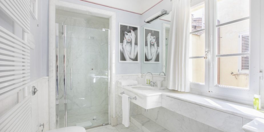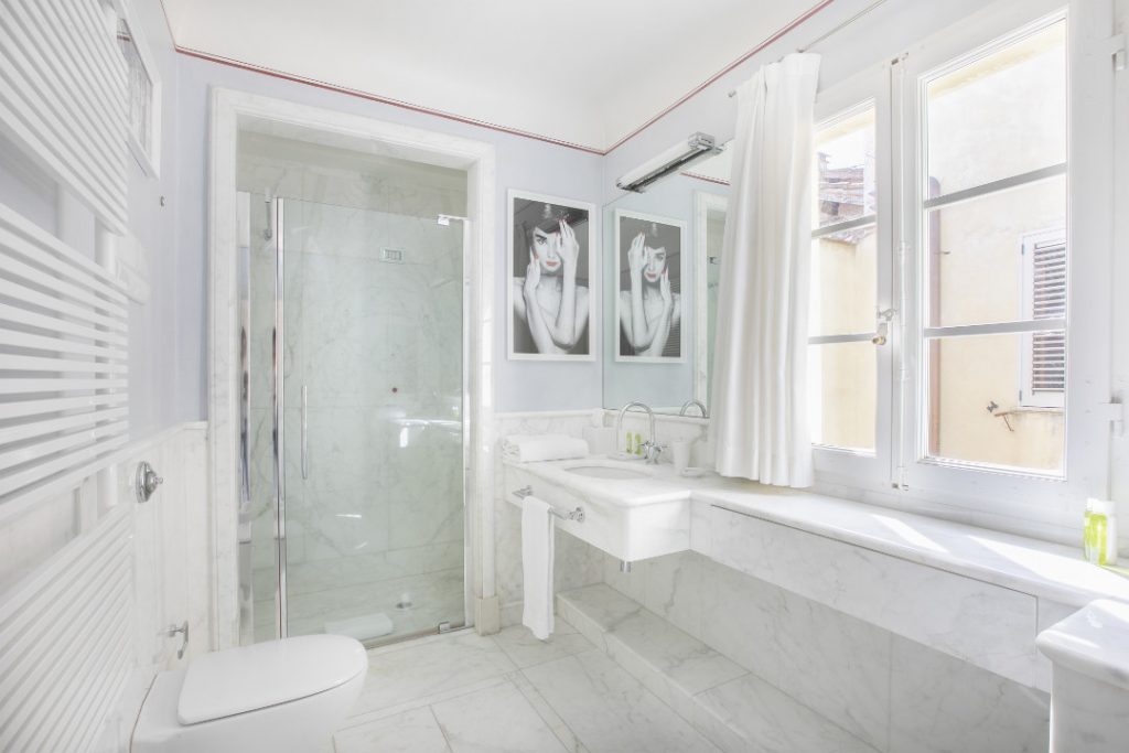 L’elegante bagno, illuminato da una grande finestra, è rivestito in marmo e dispone di un doppio lavabo e doccia per due persone.
