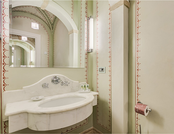 The bathroom is thus reserved for the fittings and a washbasin made of valuable white statuary Calacatta marble, inside a space finely decorated with rural patterns.