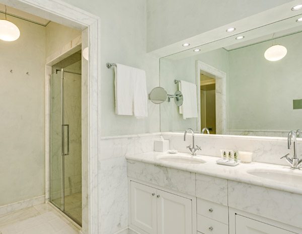 The spacious bathroom featuring exclusive white Calacatta marble reflects the same elegant style. It has a large window overlooking the internal courtyard, two washbasins and a large shower.